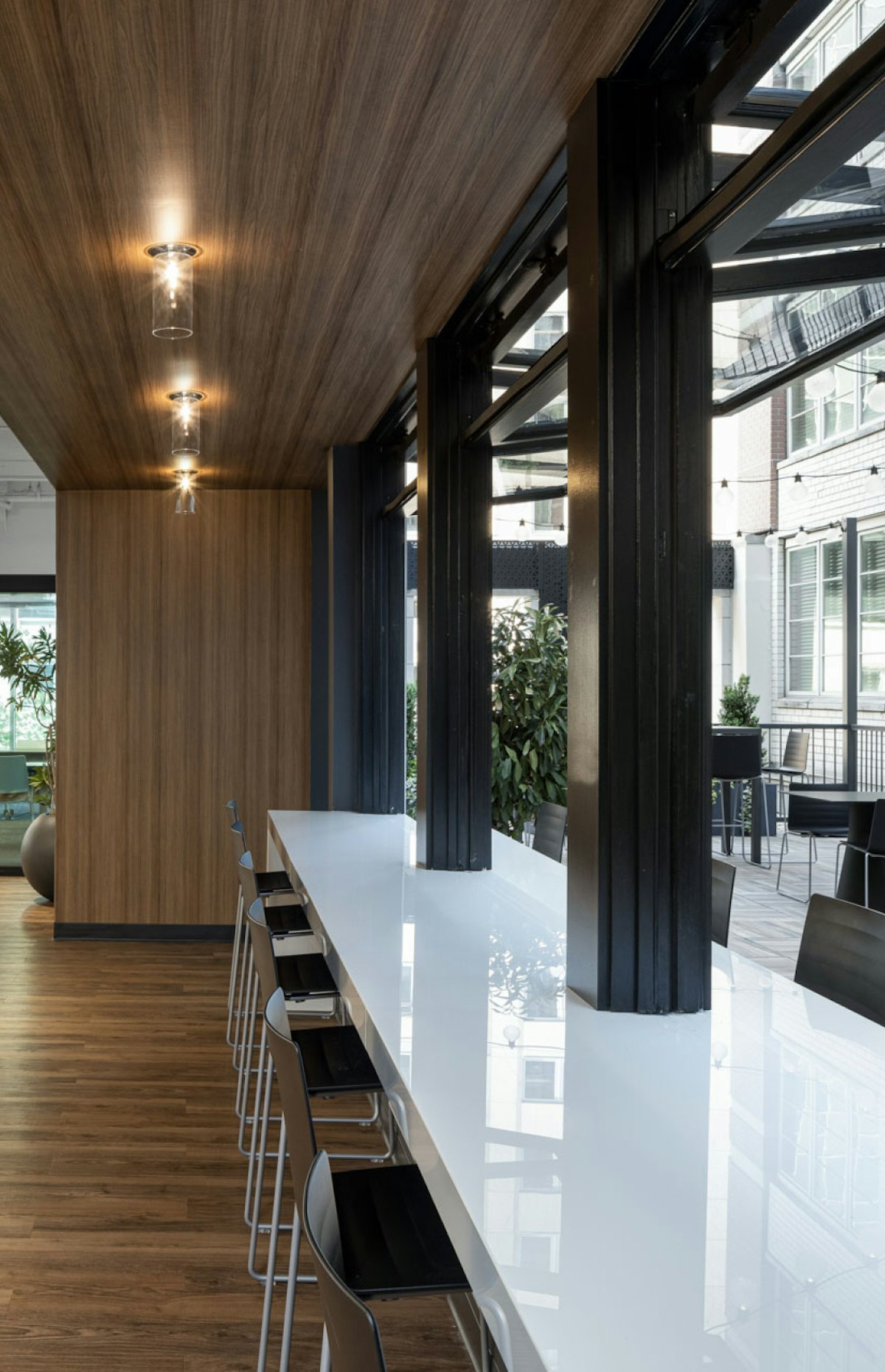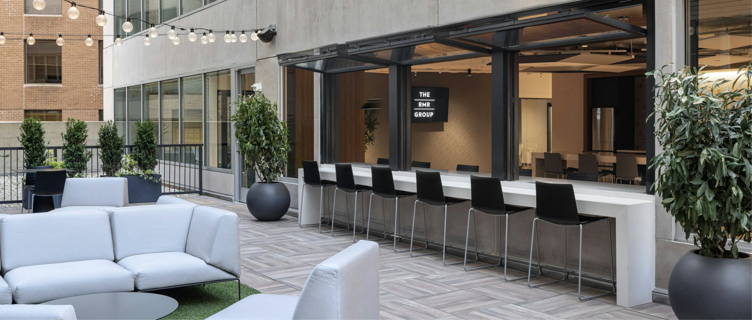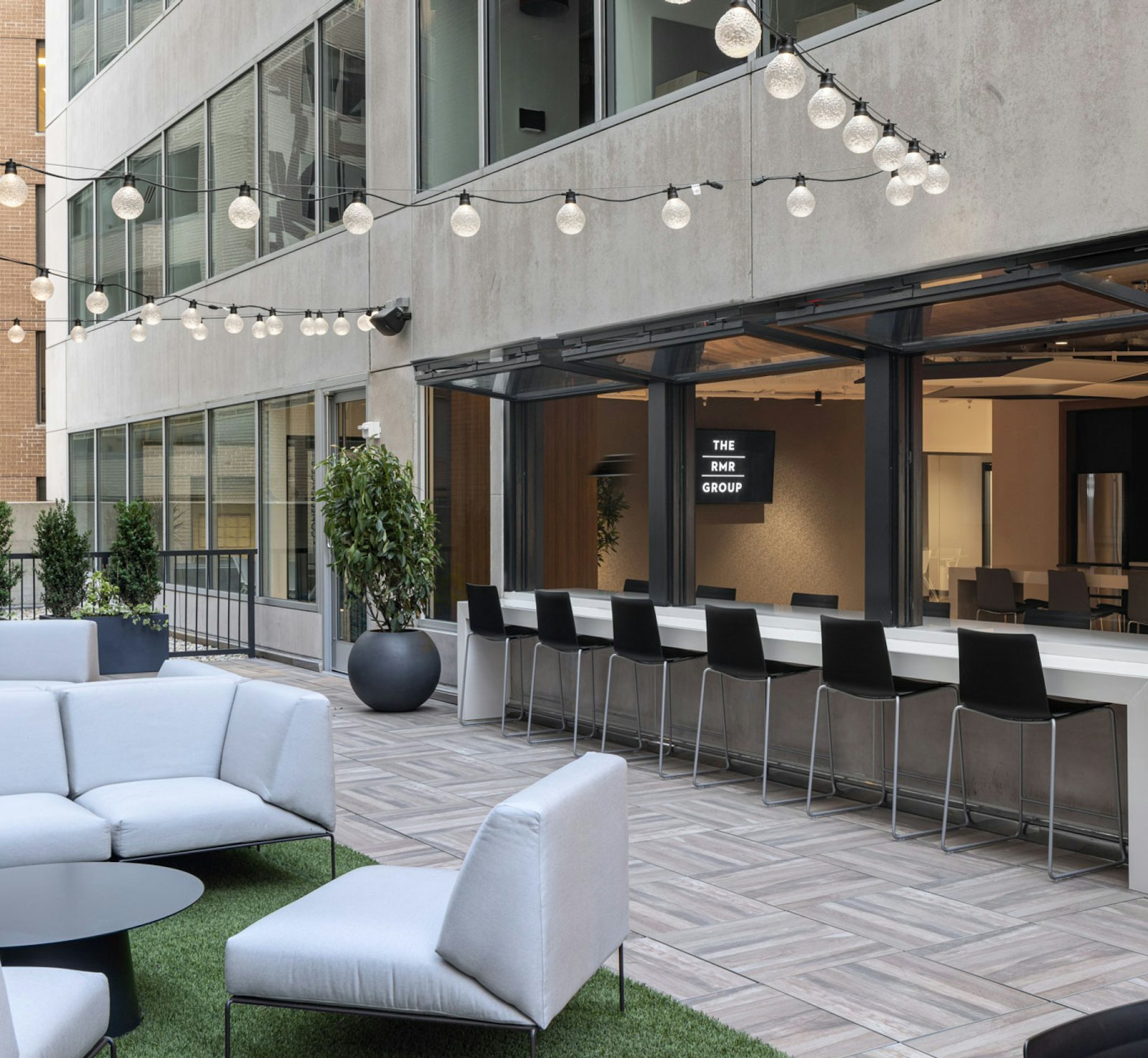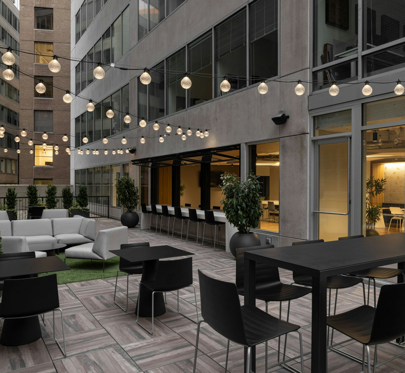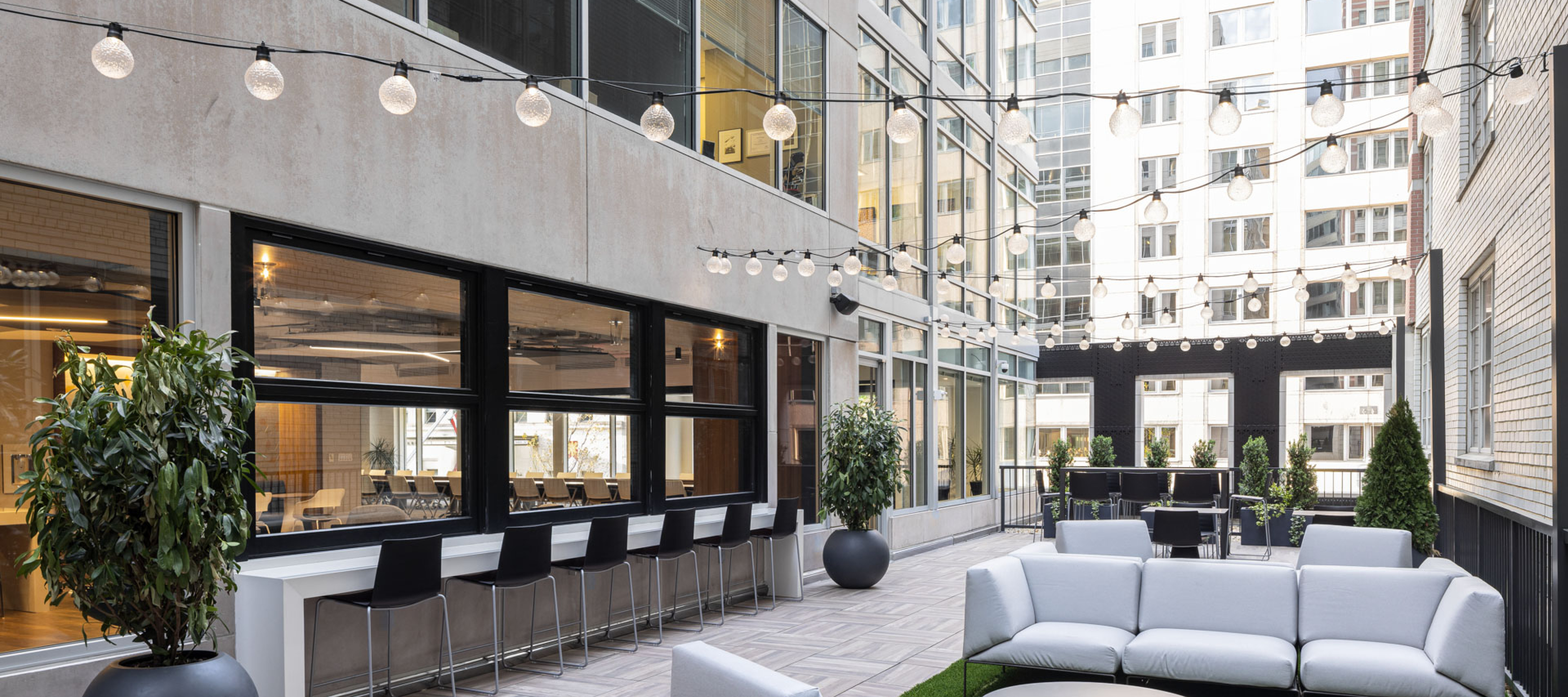 GTM’s design layout for the new amenity spaces extended an existing terrace to increase the exterior space and create more circulation throughout the various amenity areas. Operable horizontal bi-fold windows replaced a portion of the existing storefront to connect the interior and exterior spaces. The exterior garden terrace also has ample seating, warmed by string lights which add charm to function. ADA restrooms and privacy booths were also incorporated into the design, completing a diverse and flexible array of multifunctional amenities for private events or conferences, as well as daily use.