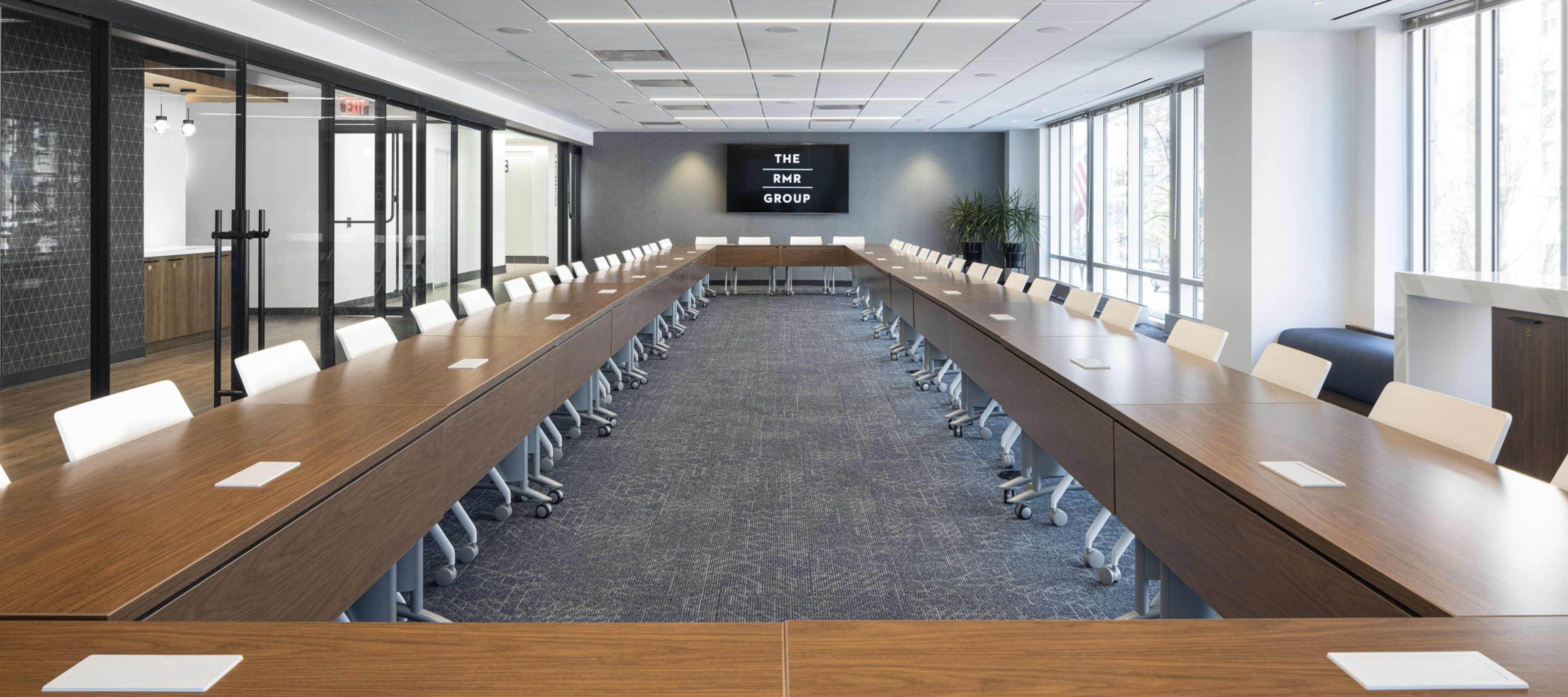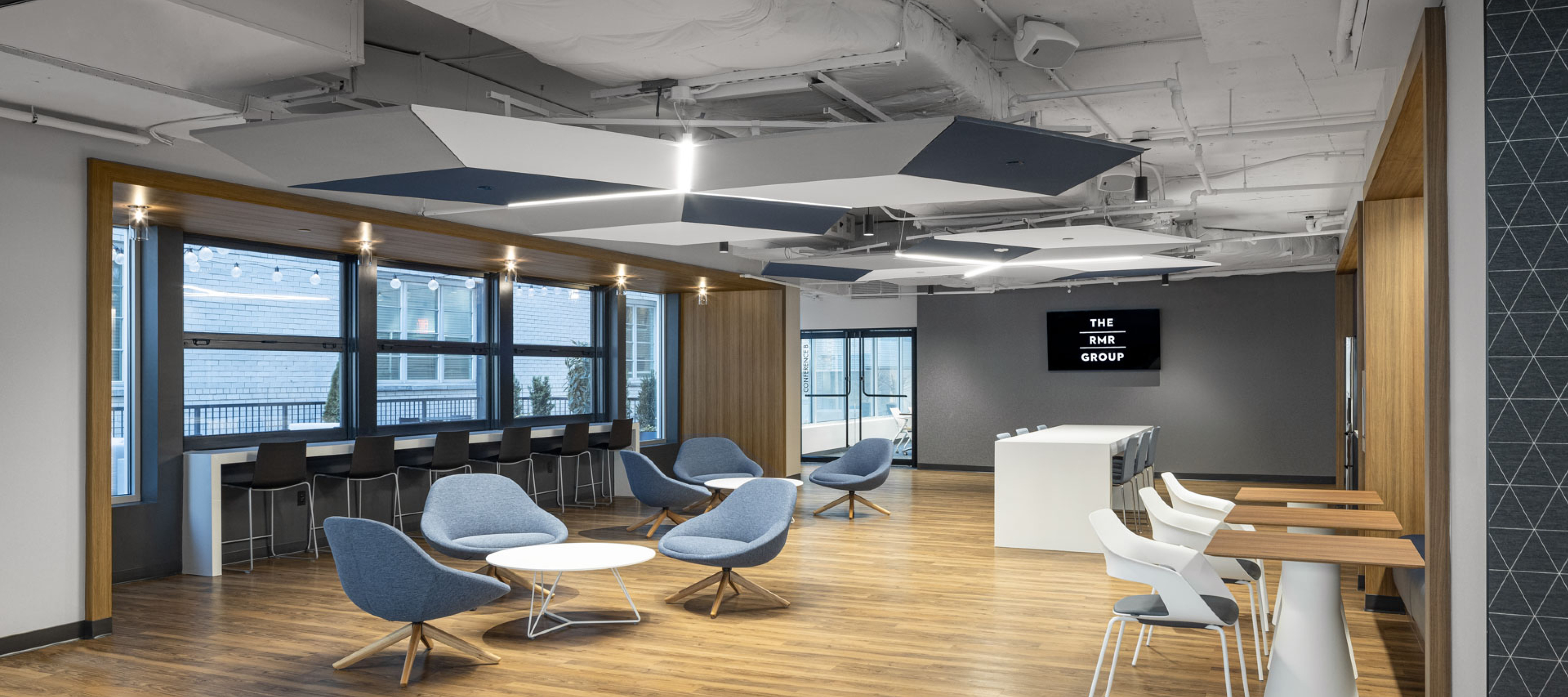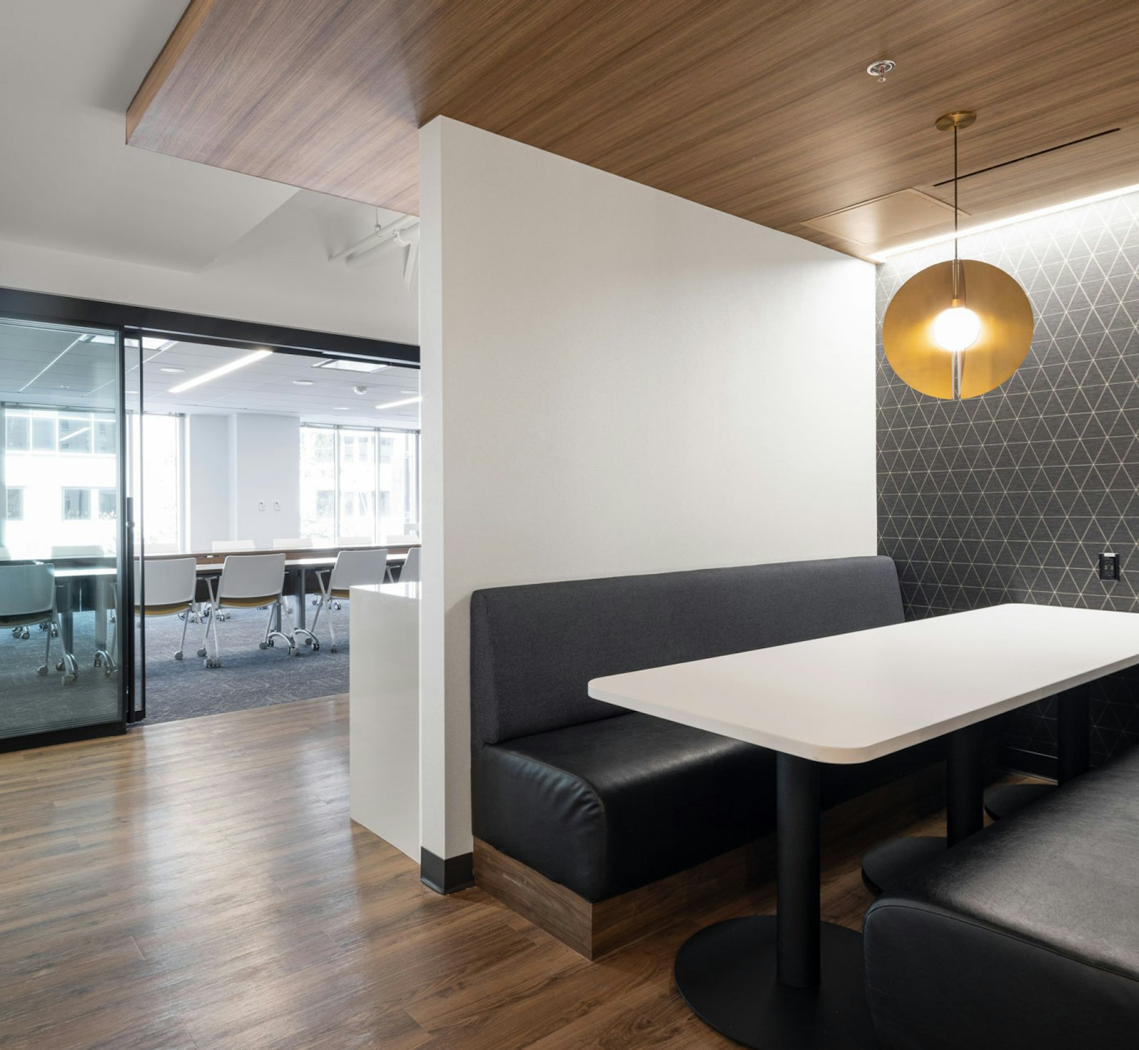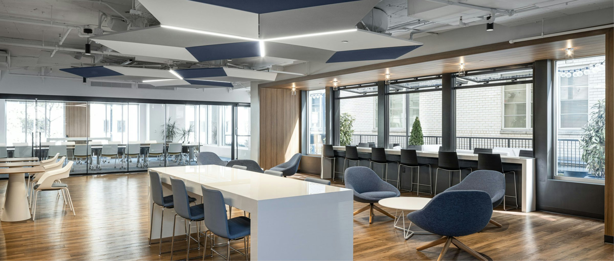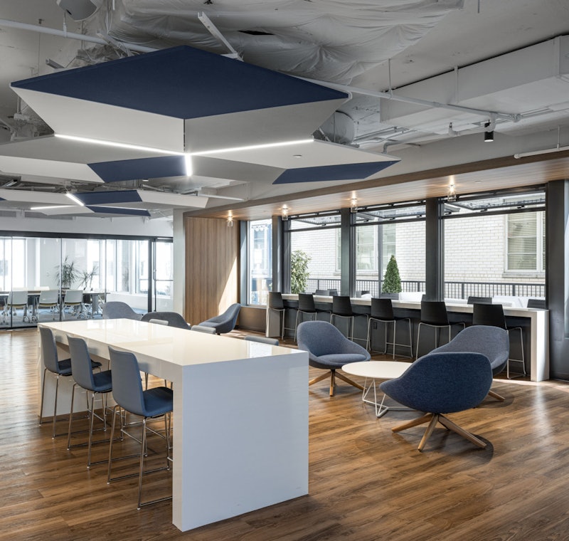 Fulfilling a major need within the building, a large 50-person training room with an expansive 30-foot telescoping door system was created on the 2nd floor, as well as an additional 30-person conference room capable of splitting into smaller rooms utilizing a bi-fold operable partition. A pre-function space was designed with various multifunctional seating, including high-top tables and chairs, built-in banquette dining and an inviting lounge area. This space also encompasses a large catering area with built-in storage, sink, refrigerator and keg tap.