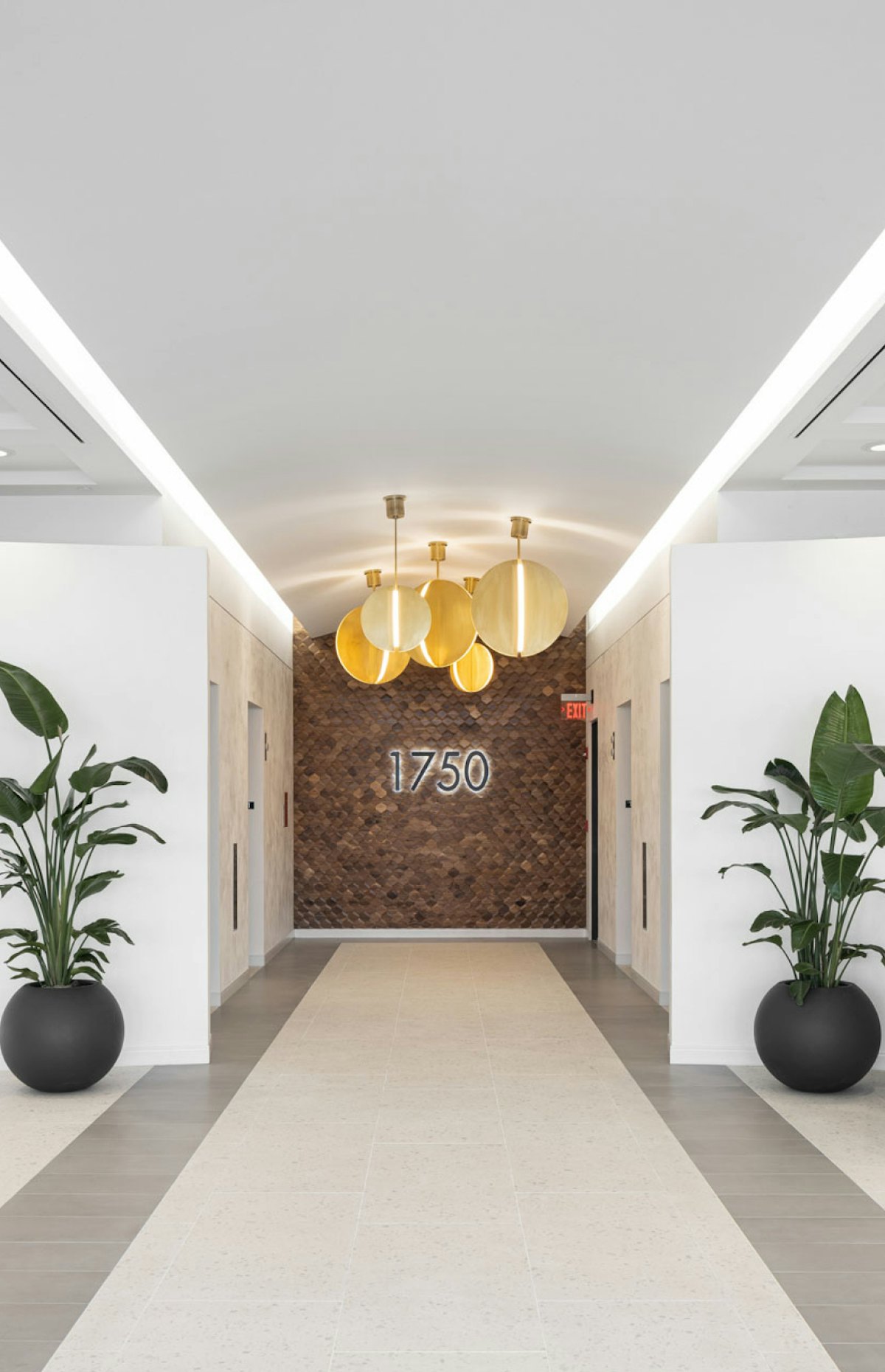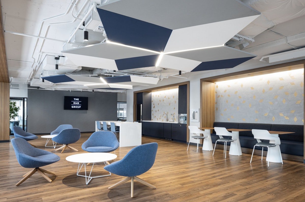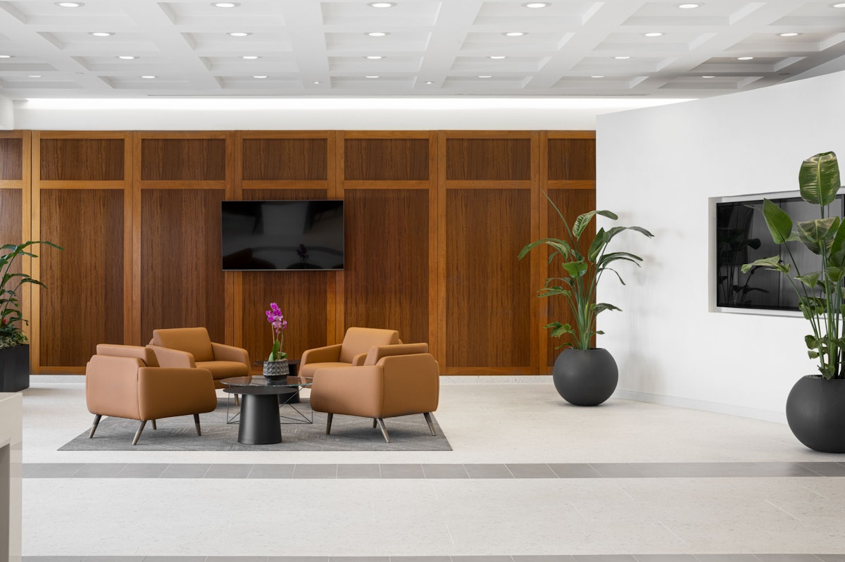 While retaining existing elements in the lobby for budgetary constraints, such as wood wall panels and coffered ceilings, GTM provided a new, modern design by skim-coating the wall tile with a white stone-like plaster and selecting porcelain floor tiles resembling terrazzo to complement the original, traditional design elements. Grey accent tile flooring carried from the entry through the elevator lobby visually welcomes you, while a textured wood wall with backlit signage along the back anchors the space. Reception and seating areas were relocated for better use of space, and new lounge furniture, high top table, and large, decorative brass LED pendants revitalize the space.