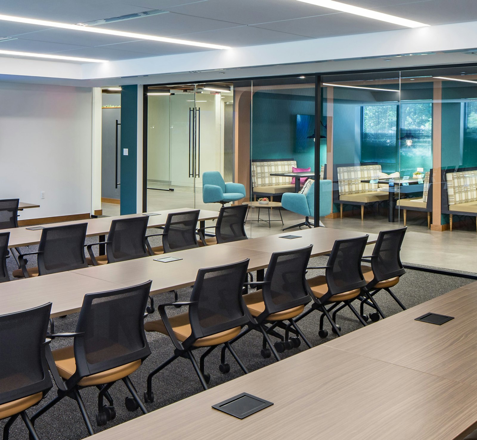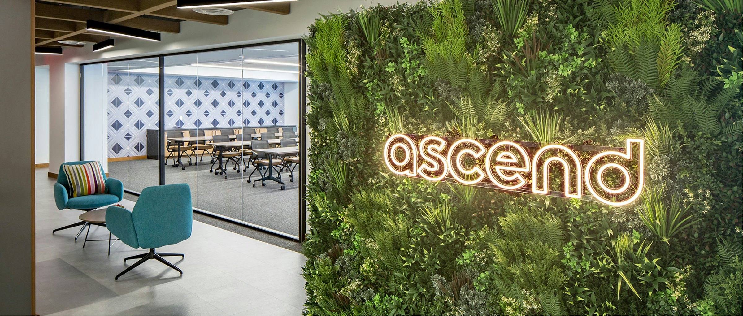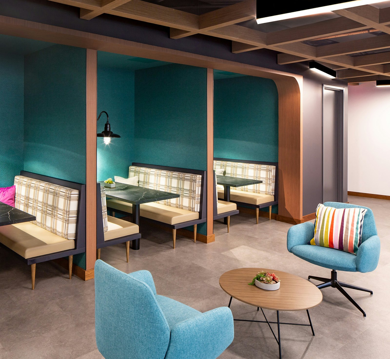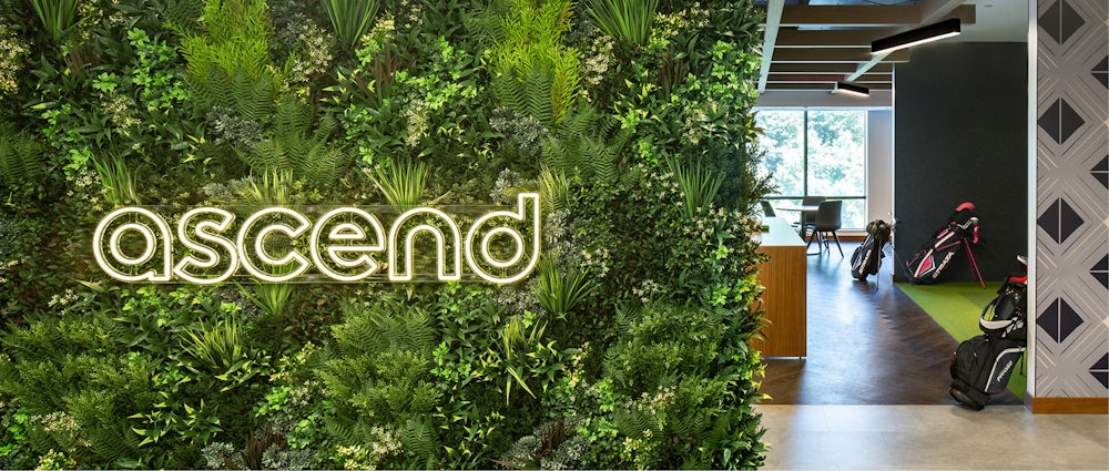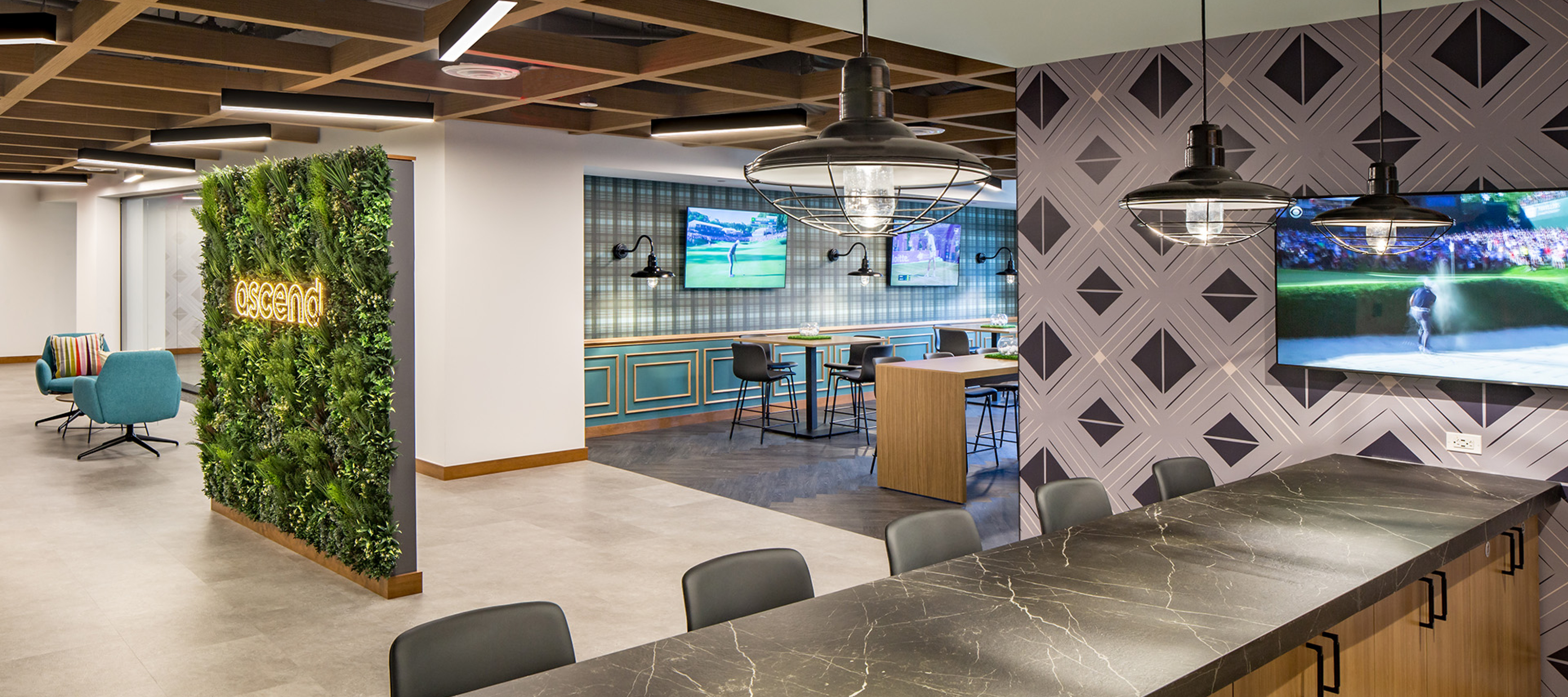 This building repositioning project includes the design of the 4th-floor amenity center at 5425 Wisconsin Ave in Chevy Chase, MD, into a dynamic and multifunctional space that merges modern amenities with a subtle, retro-inspired design. Featuring a golf simulator, arcade games, and flexible seating options, the space encourages relaxation and social interaction for building occupants. An operable glass partition allows the conference center to flow into the lounge, enhancing versatility. The ceiling, crafted from acoustic felt with a wood-look finish, effectively controls sound while adding warmth to the design. Building branding is incorporated with a prominent neon “Ascend” logo, reinforcing its unique identity. The design nods to classic country clubs with vibrant plaid patterns and wood paneling, creating a fun, nostalgic environment that elevates the overall tenant experience.