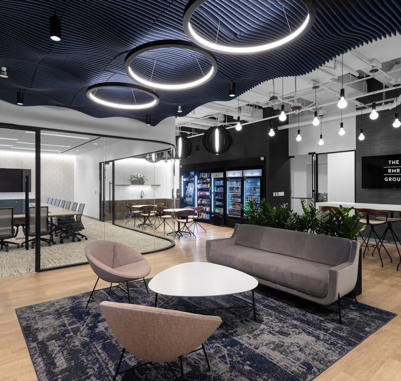 GTM’s design concept embraces a clean, modern aesthetic punctuated with dark blue accents, creating a crisp, professional atmosphere that maintains visual interest. Black pendant light fixtures serve as striking contrasts against the white backdrop, adding depth and sophistication to the spaces.
