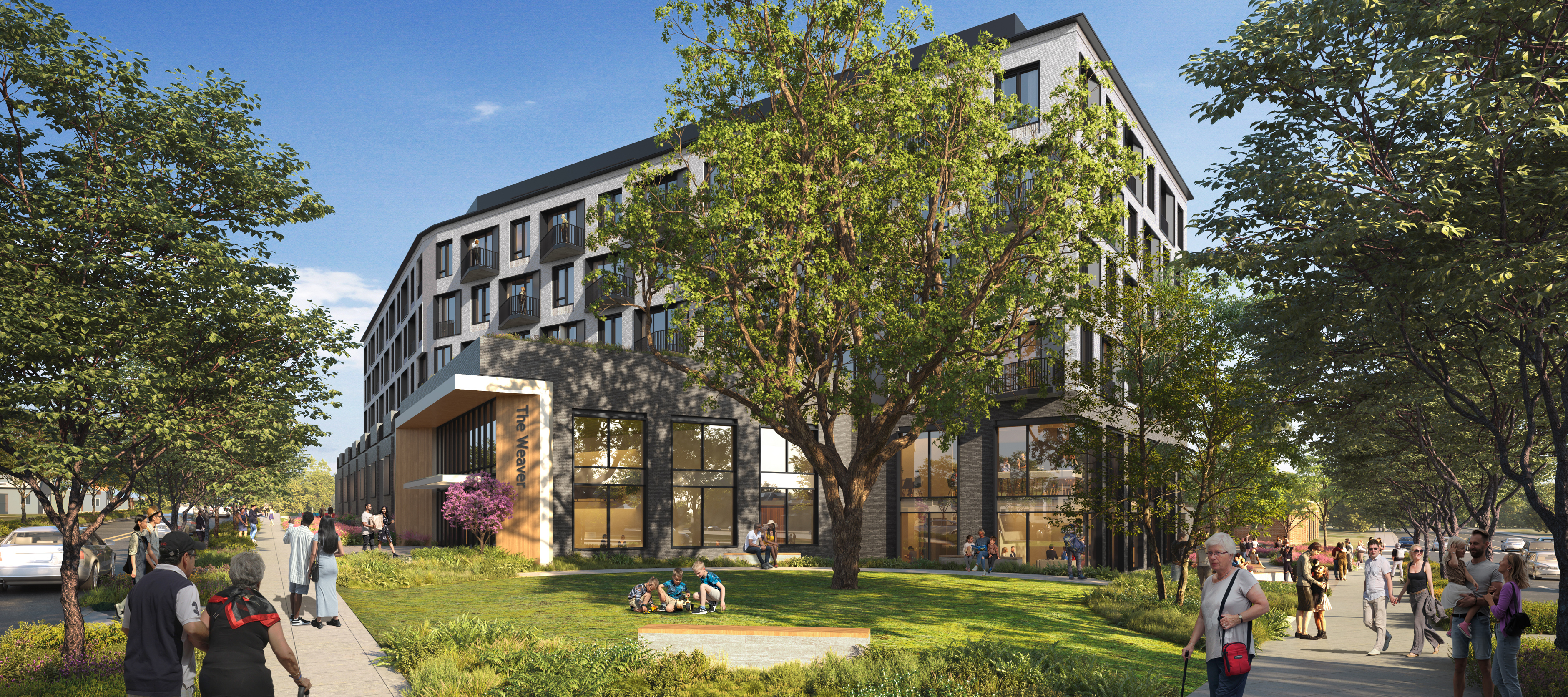 The Heritage Park is designed around the preserved large mature oak tree and creates a welcoming public outdoor space of respite.