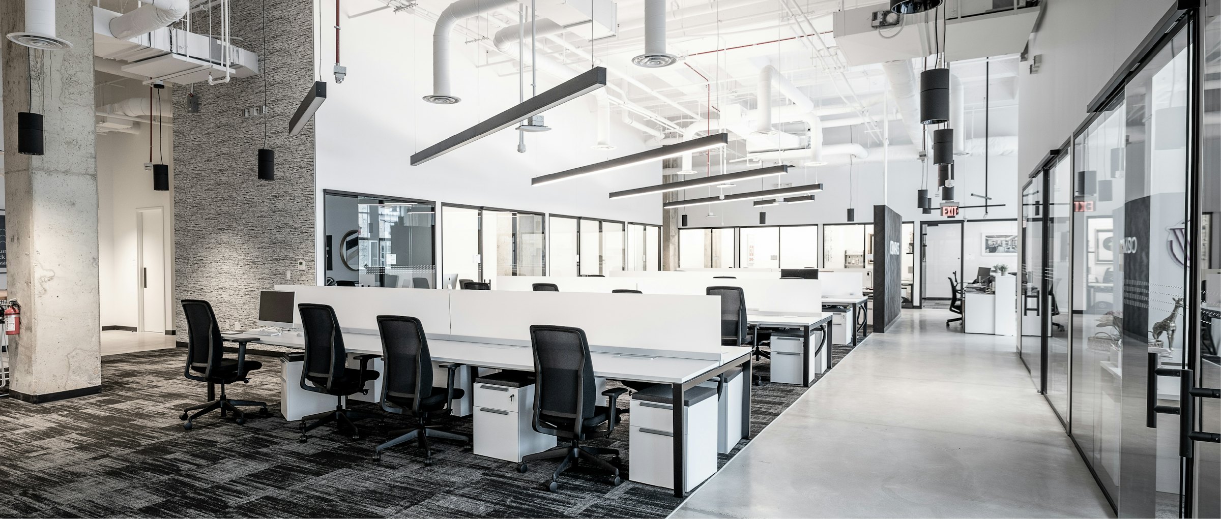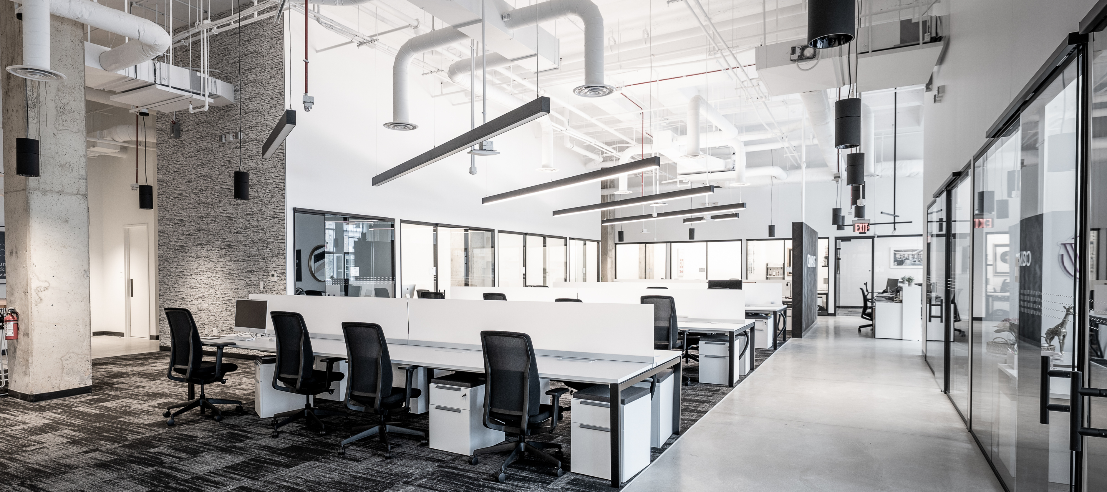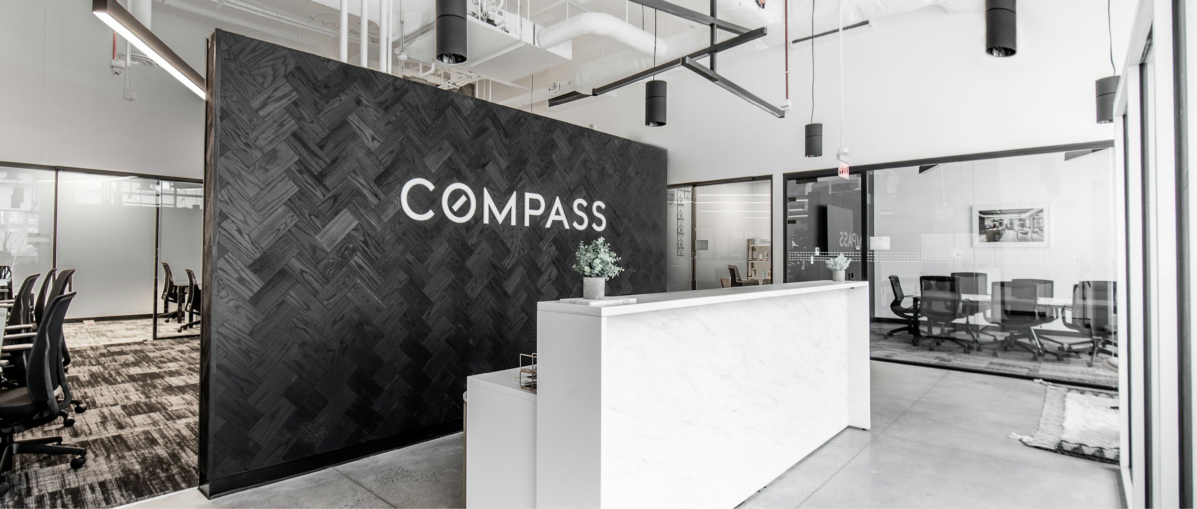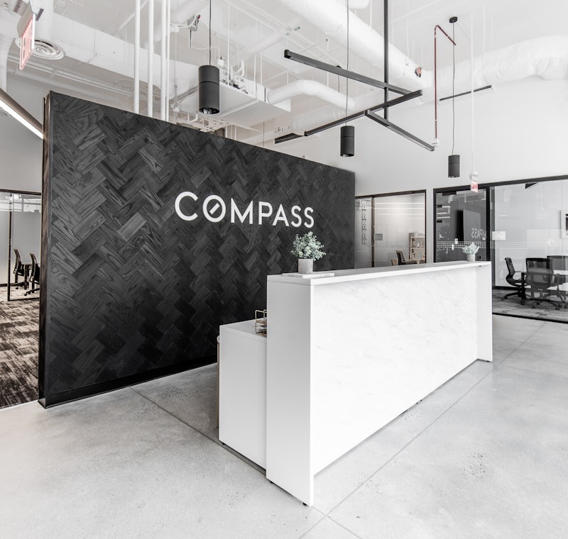For Compass Real Estate’s new office in Potomac, MD, GTM implemented a design concept that was minimalistic, sleek, sophisticated and industrial. The final design was achieved by using a black and white color palette, concrete floors, exposed ceilings and a front glass wall system throughout the space.