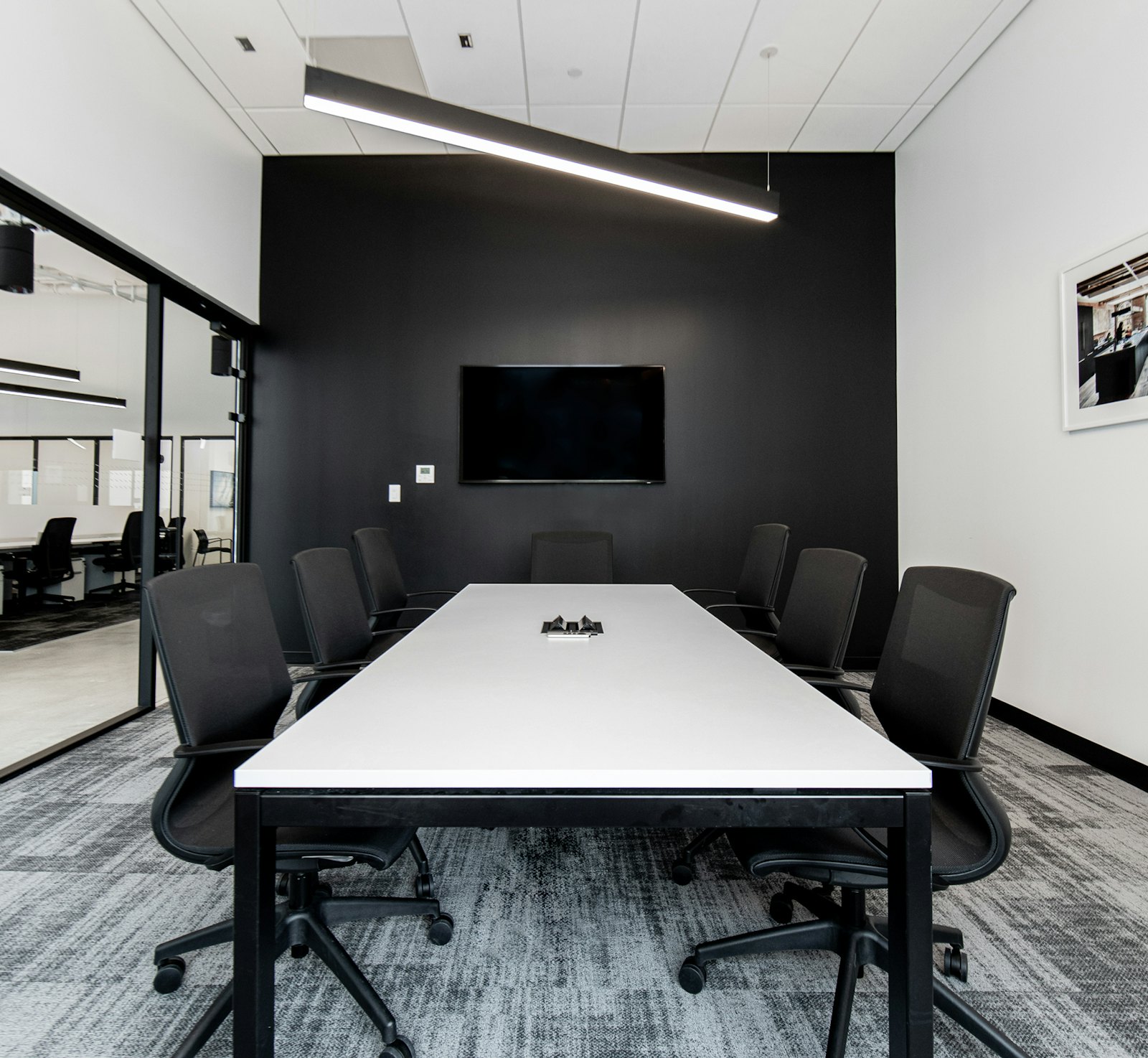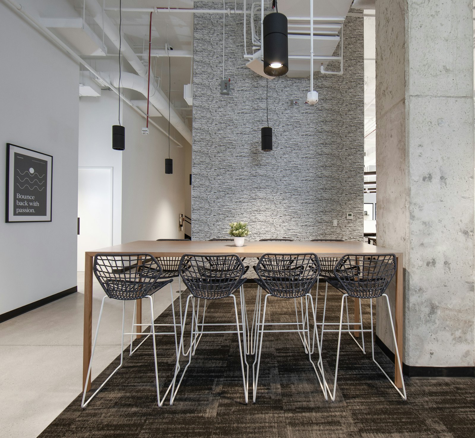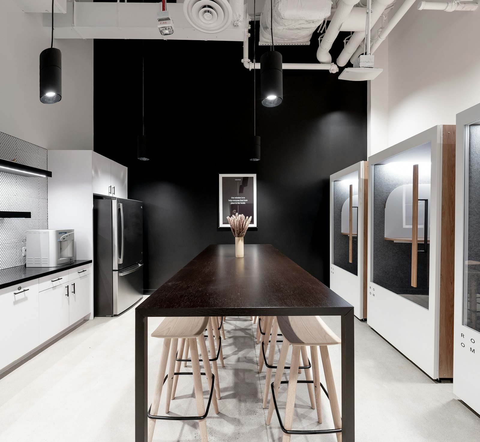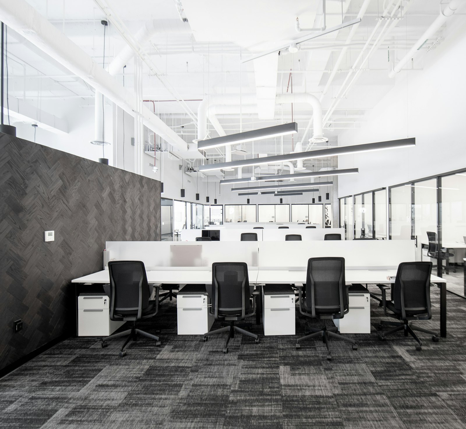 For Compass Real Estate’s new office in Potomac, MD, GTM implemented a design concept that was minimalistic, sleek, sophisticated and industrial. The final design was achieved by using a black and white color palette, concrete floors, exposed ceilings and a front glass wall system throughout the space.