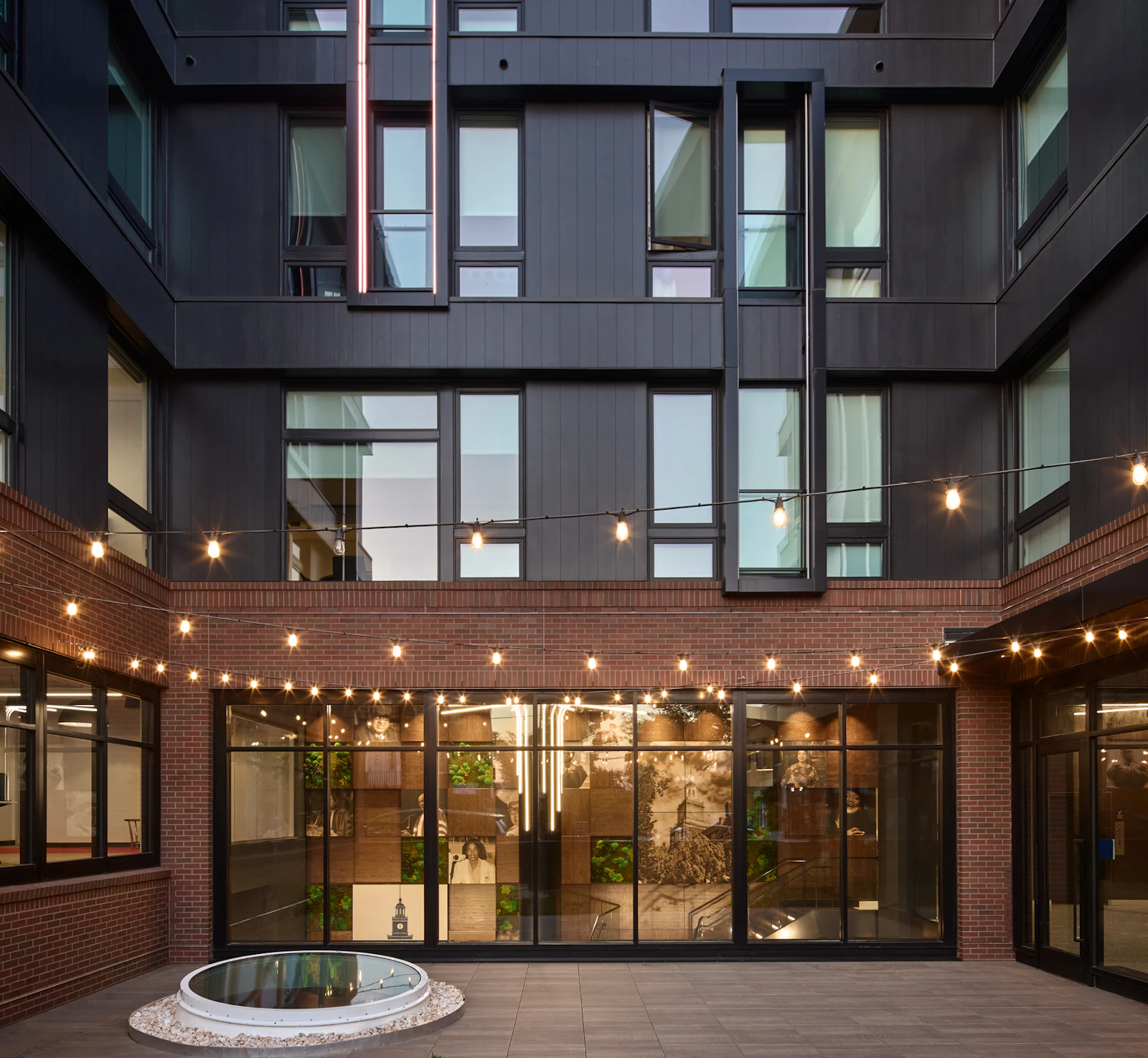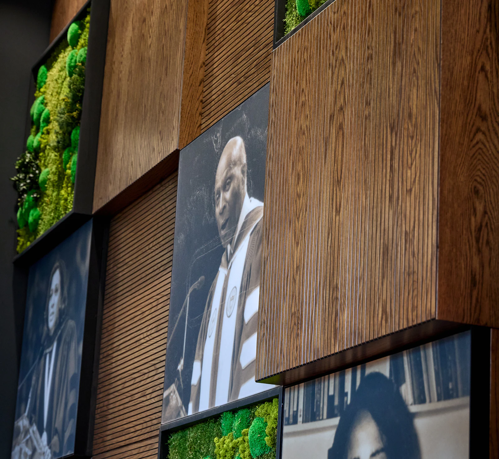At the heart of the design is a monumental stair framed by a wood-paneled feature wall showcasing back-lit portraits of iconic alumni within custom lightboxes. Symbolizing growth and legacy, this focal point connects to a skylit lower-level event space framed by warm wood tones, terrazzo flooring, and inviting lounge areas.