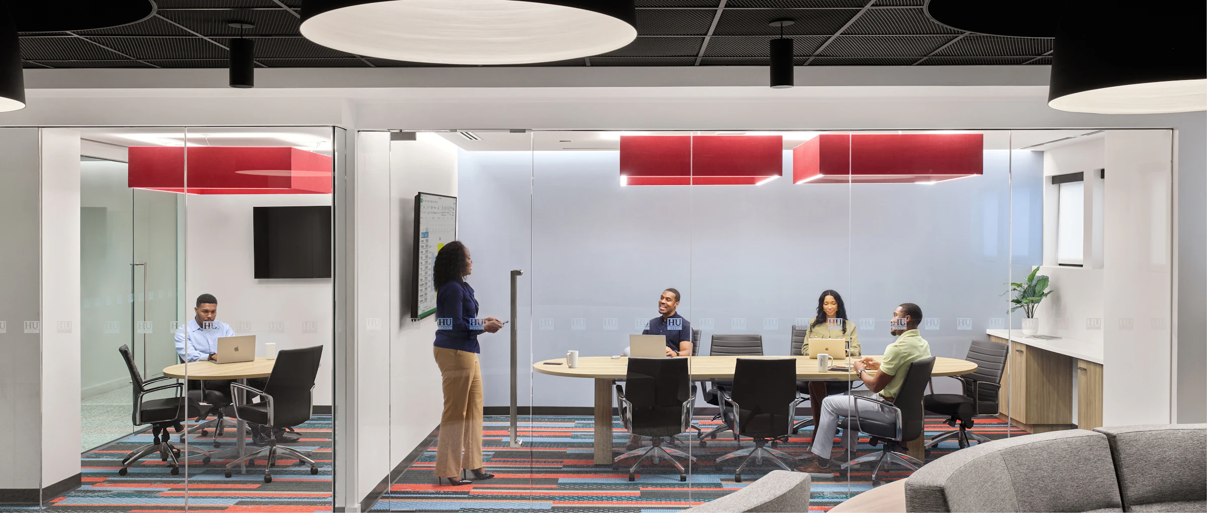 Howard’s identity is woven throughout, seen in the blue accented reception desk, logo-applied glass partitions, and color accents defining departmental zones. Designed for flexibility and inclusivity, the center integrates podcast and Zoom rooms, acoustic treatments, and varied sensory environments.