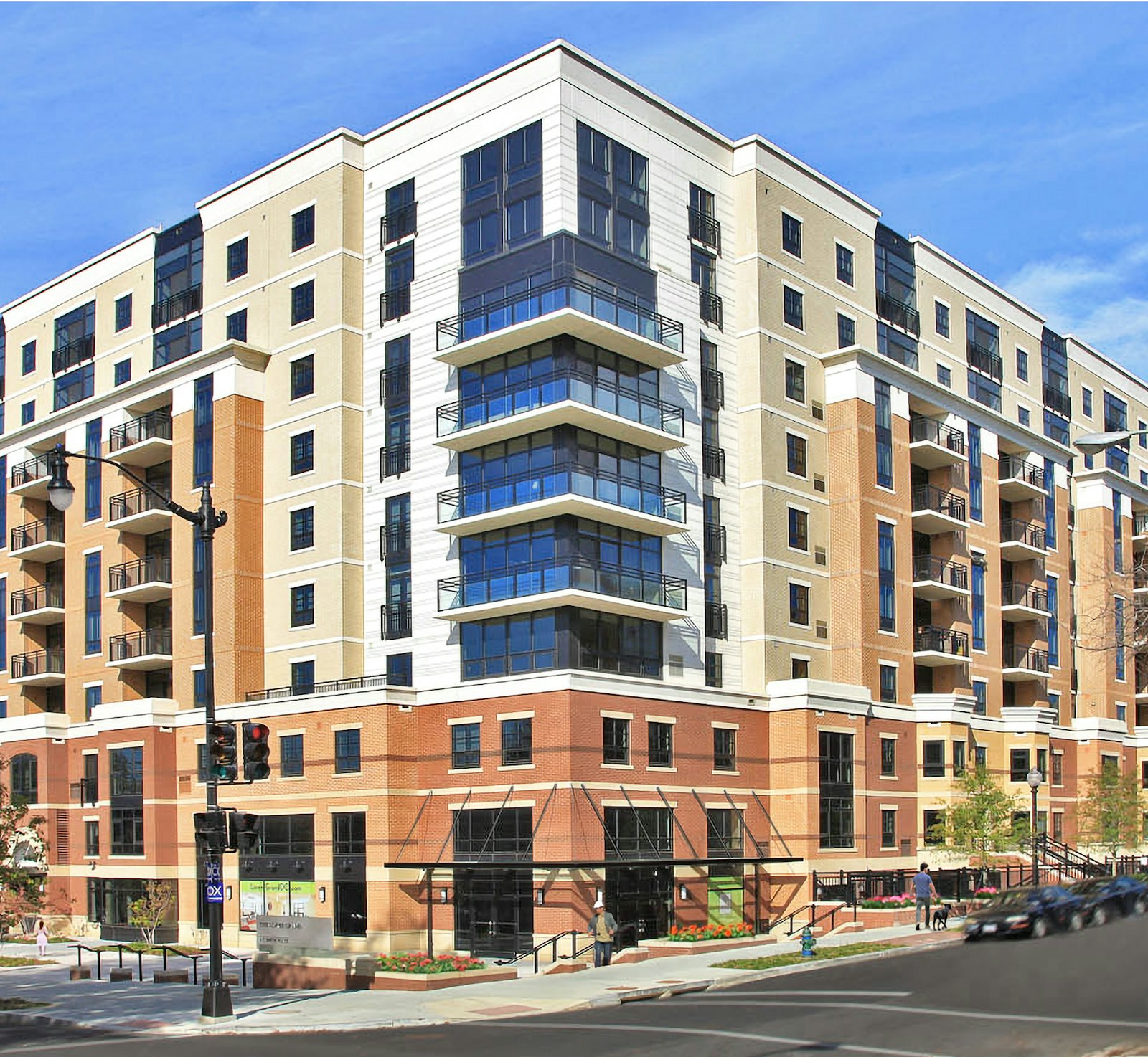Generous balconies and floor-to-ceiling windows connect residents to the active streetscape, while a vertically expressed corner massing defines the building at a key intersection. Ground-floor retail enhances walkability and integrates seamlessly with residential uses.