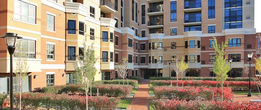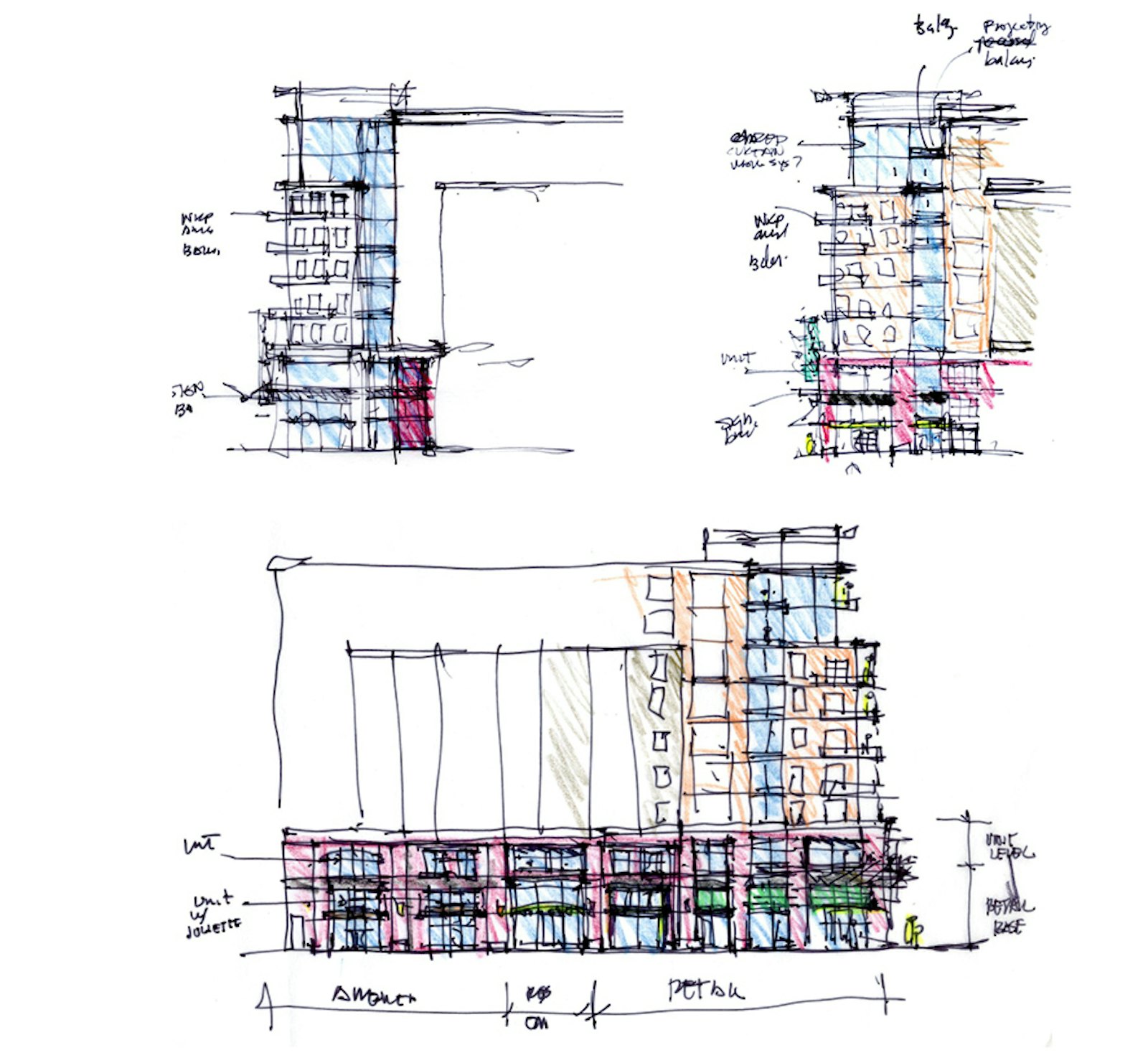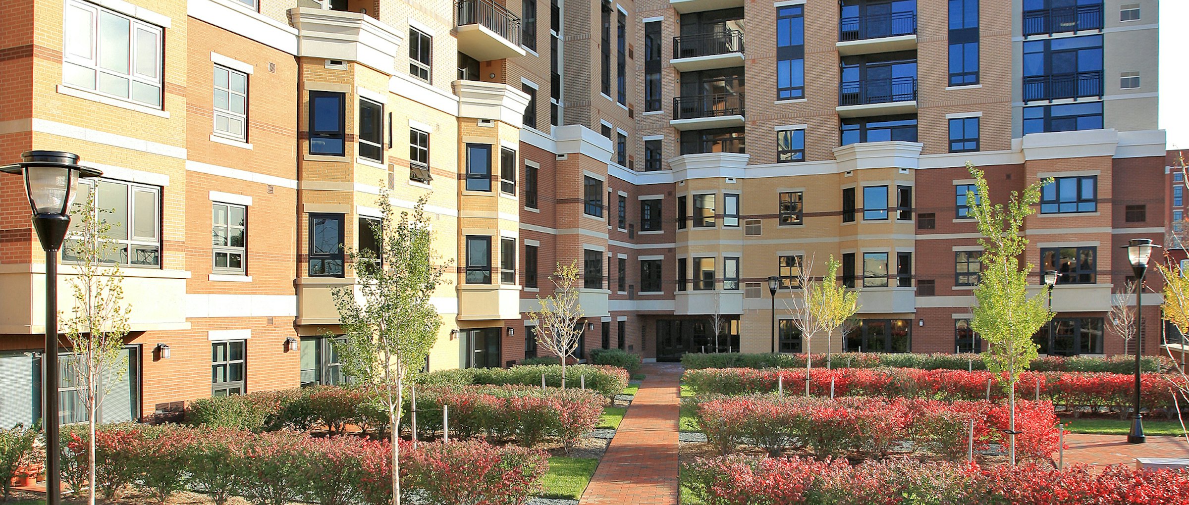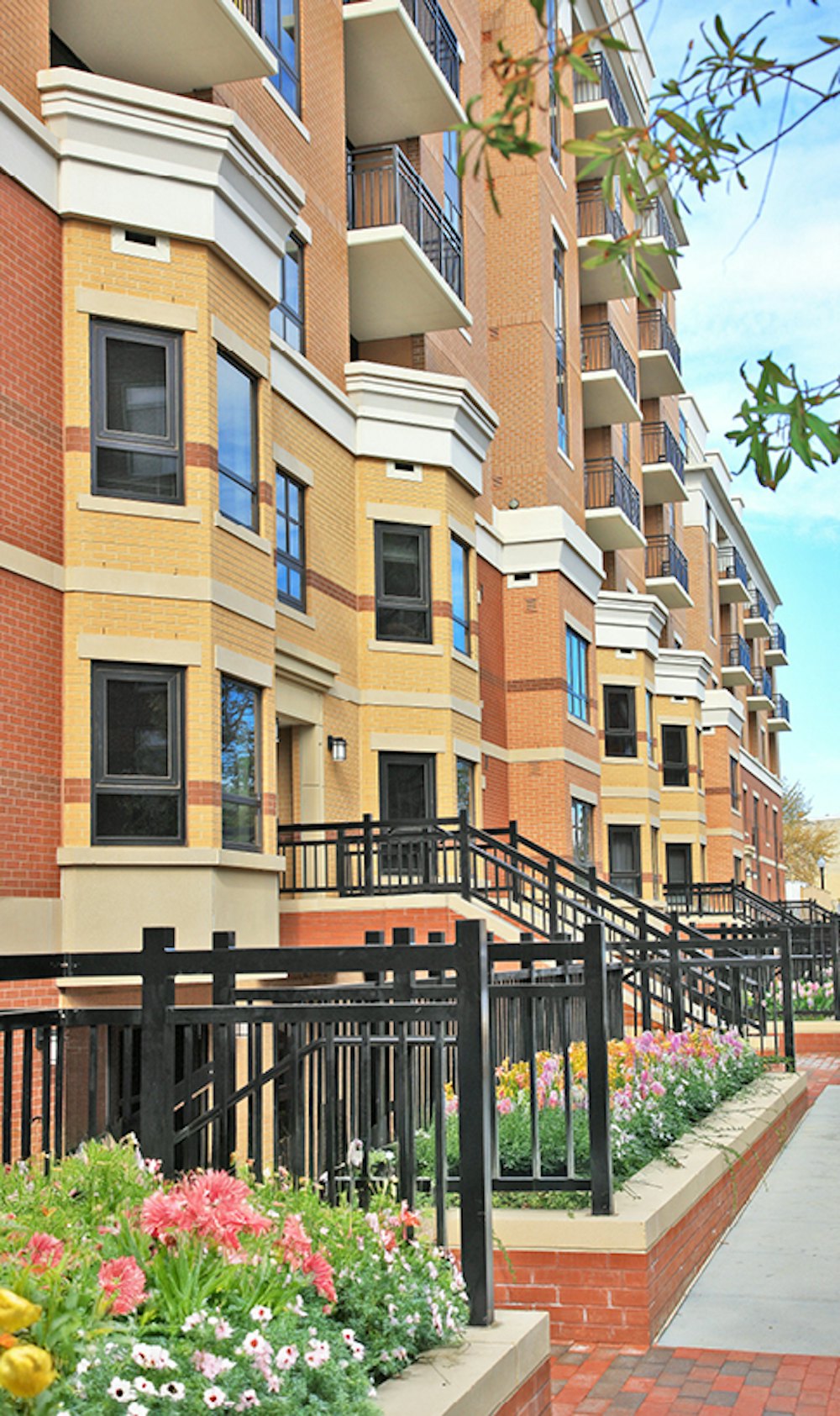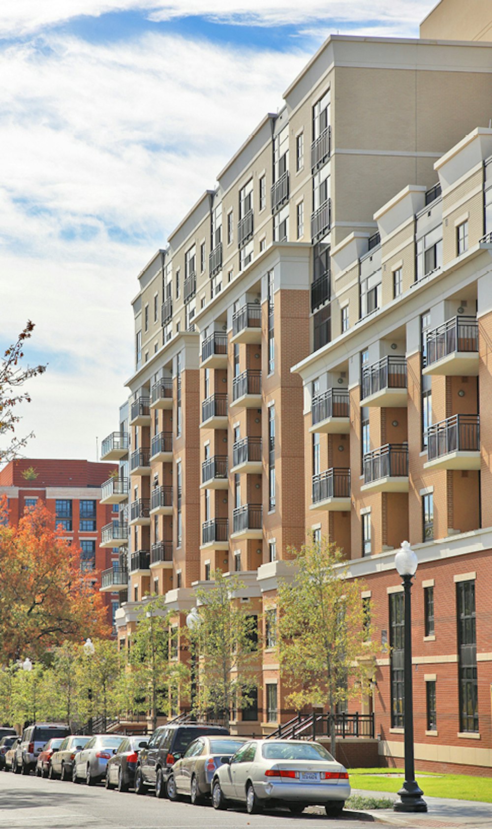 A red brick base anchors the building within its context, while lighter upper levels provide contrast and visual relief. Vertical bays, articulated balconies, and prominent corner glazing introduce rhythm, transparency, and expansive views.