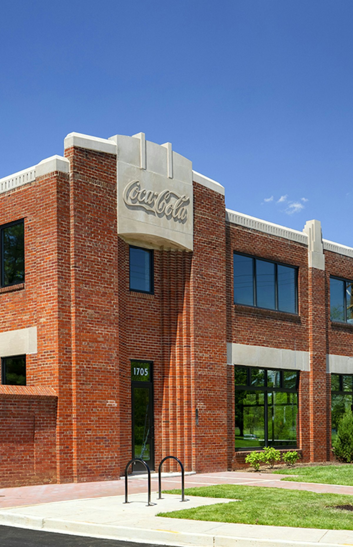A Frederick landmark since 1947, the Coca-Cola Bottling Plant is known for its Art Deco-inspired industrial design. After years of vacancy, GTM|Architects repurposed the building, preserving its iconic facade and transforming it into office space with a ground-floor restaurant. Today, it serves as the gateway to a vibrant mixed-use development, which includes a new 4-story apartment building at the rear of the site.