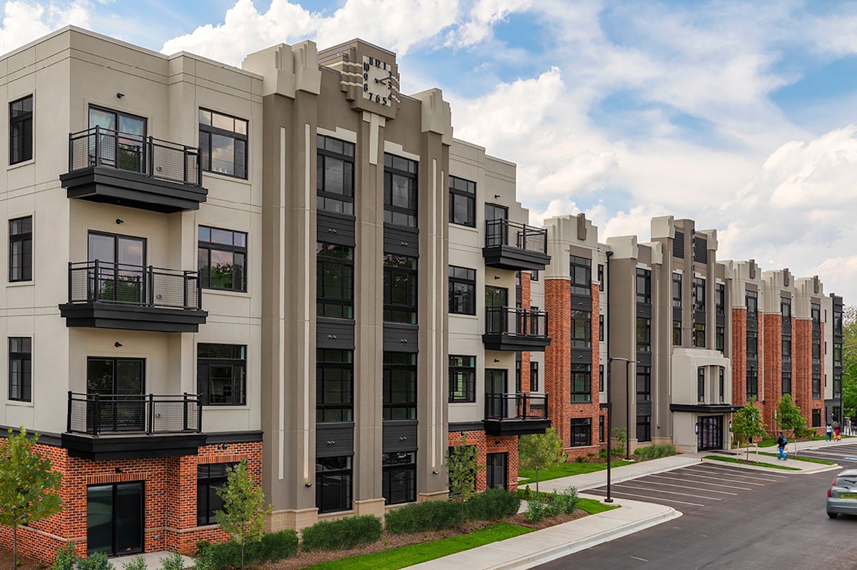 Resident amenities include a fitness center, club lounge, resort-style pool, outdoor lounges with grilling stations, and a fire pit. The design blends historic character with modern living.
