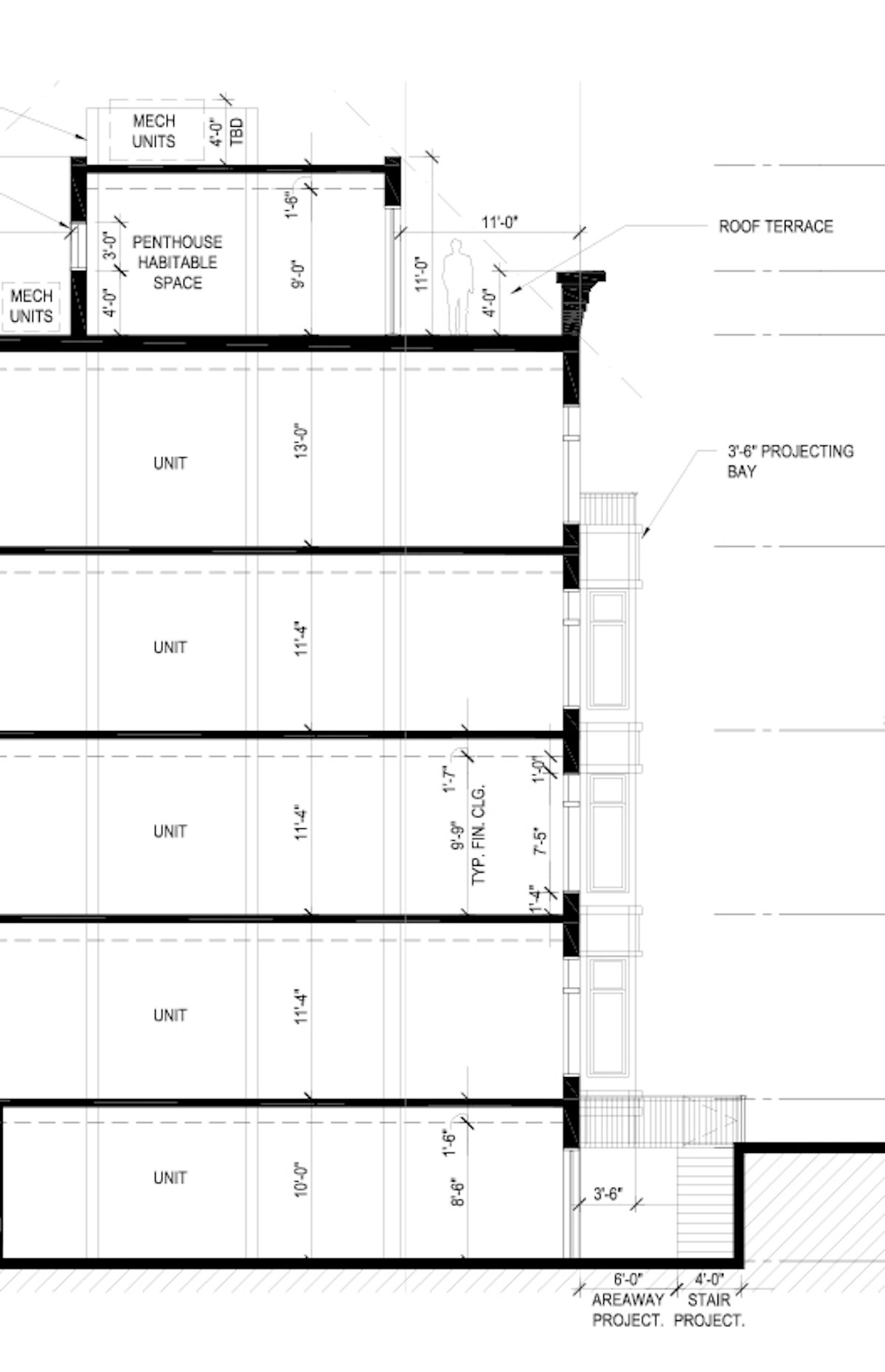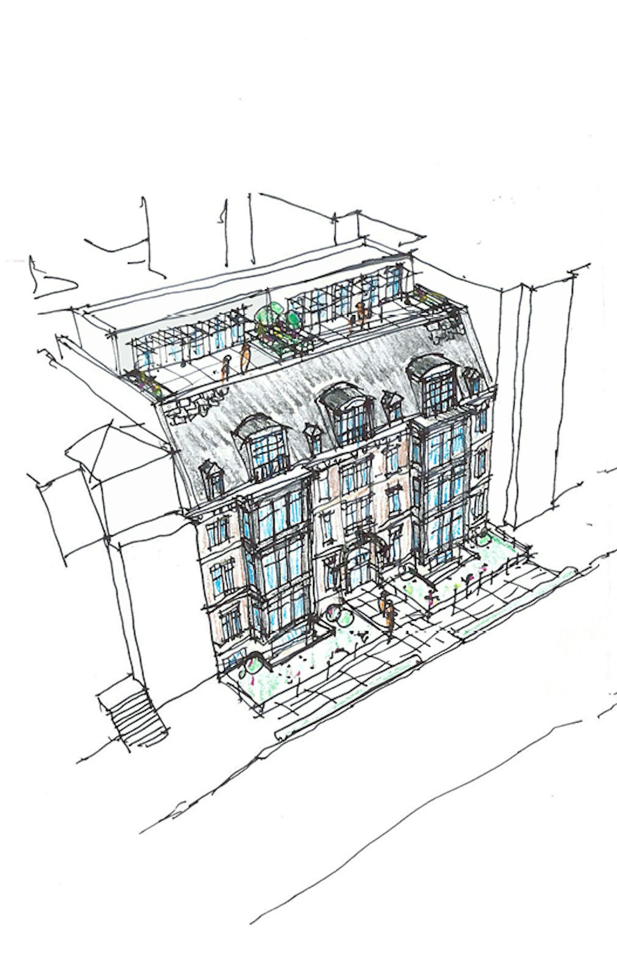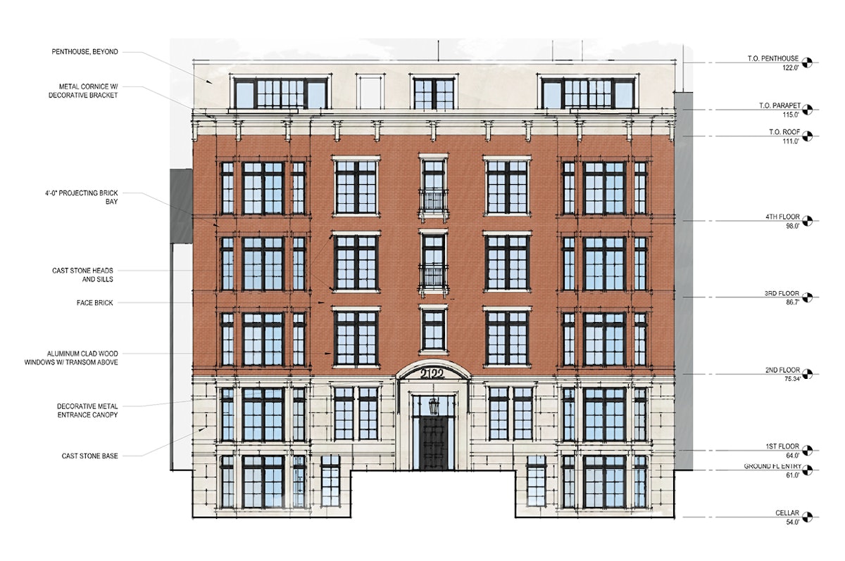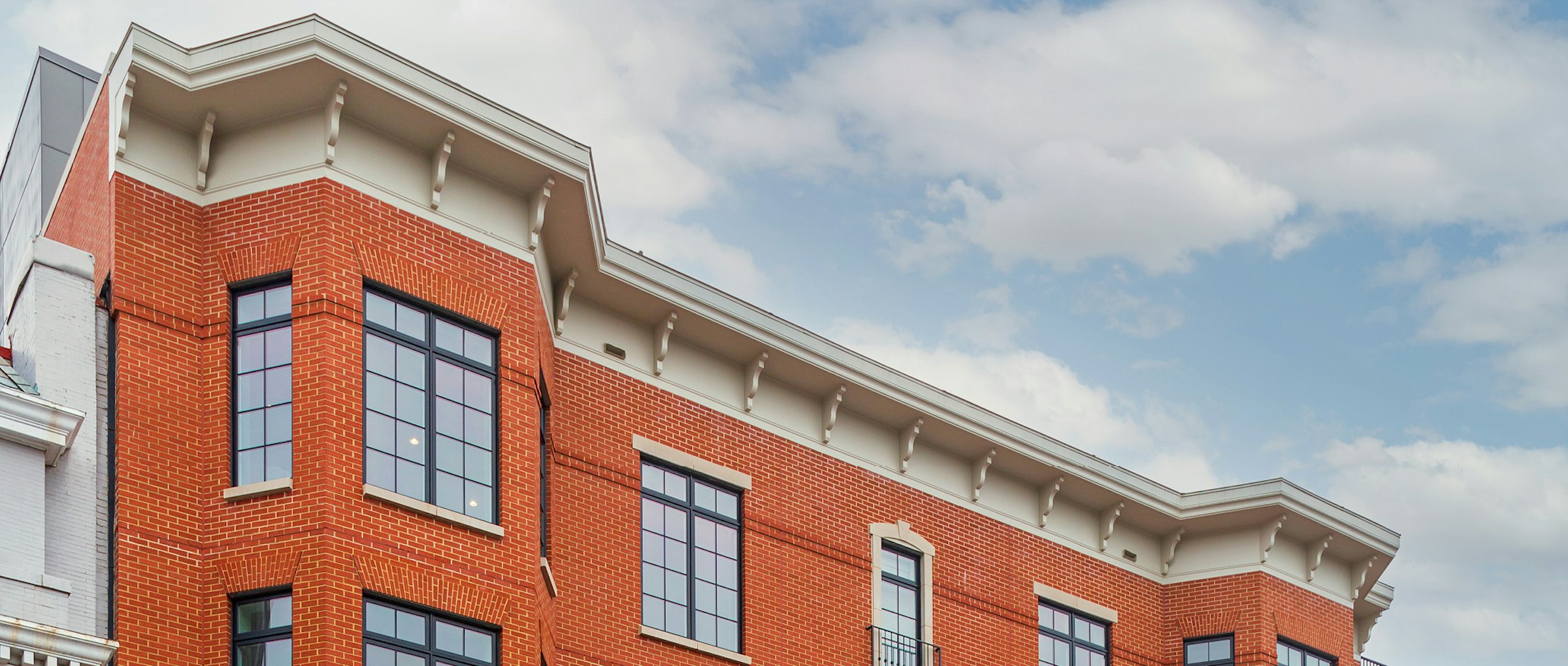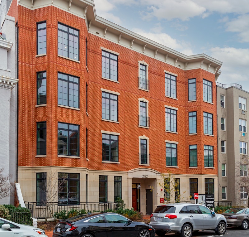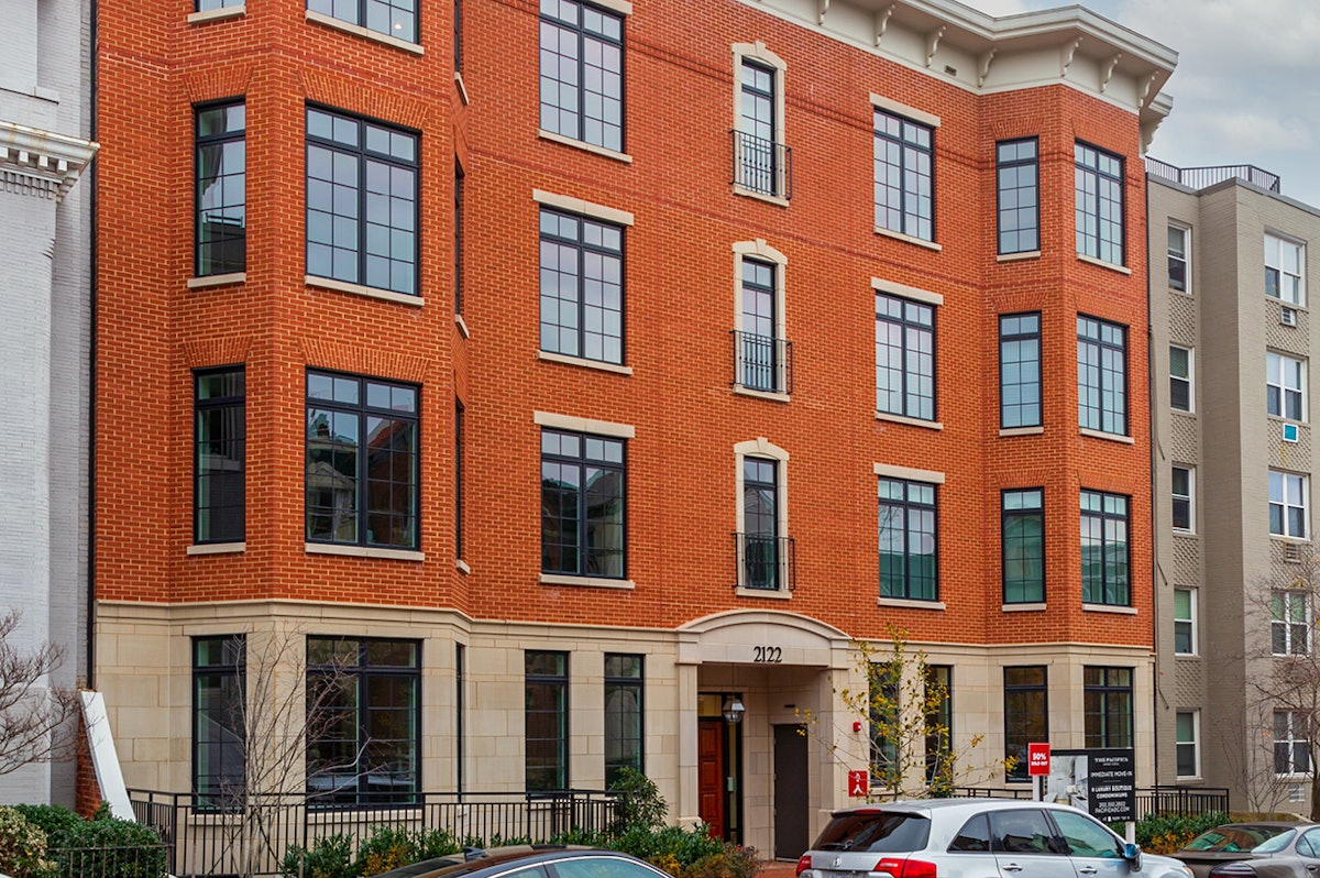 A luxury condominium in Washington, DC’s Dupont Circle thoughtfully respects the historic row homes within the Dupont Historic District. Its five-story façade blends brick and stone with carefully detailed canted bay windows that echo the neighboring homes, while a prominent decorative cornice crowns the roofline, making a confident statement while complementing the street’s historic character.