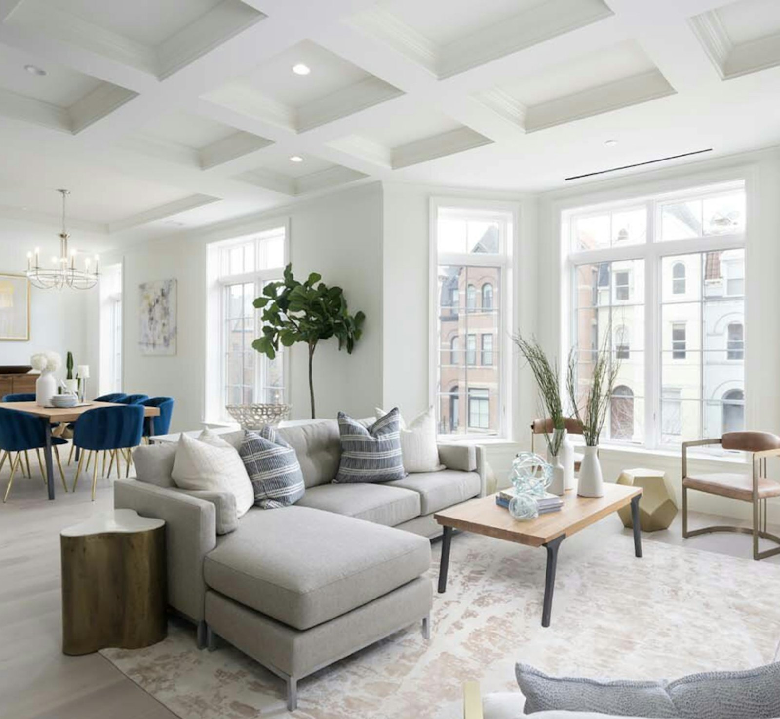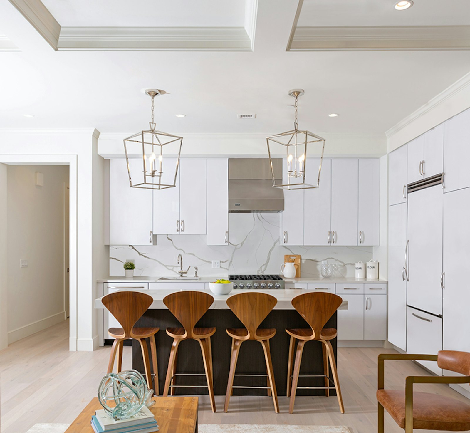 The building features nine meticulously designed residences, ranging from one- to three-bedroom layouts, including three duplexes. Fourth-floor units seamlessly connect to penthouse-level living spaces, each featuring private outdoor terraces that extend the living area. Interiors are designed to capture the inviting comfort and elegance of a single-family home, with refined trim work adding distinctive architectural character to every room.